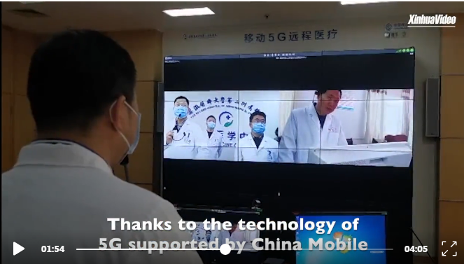 “在安徽省会合肥的医院里,医生正在使用最新的技术和设备去和病毒战斗。远程会诊是个很好的例子,病房里安装了专门设计的视频会话设备,用于收集病患的实时信息,归功于中国移动的5G技术,高清晰的动态画面可以在相互独立的病房、会议室,甚至是医生的手机之间实时传送,帮助医生在避免与病患的密切接触的同时,仍然能了解他们的身体状况。通过这一技术,省内其它地区的病人也可以享受到省会的高质量医疗服务,比如说距离合肥200多公里之外的阜阳。”