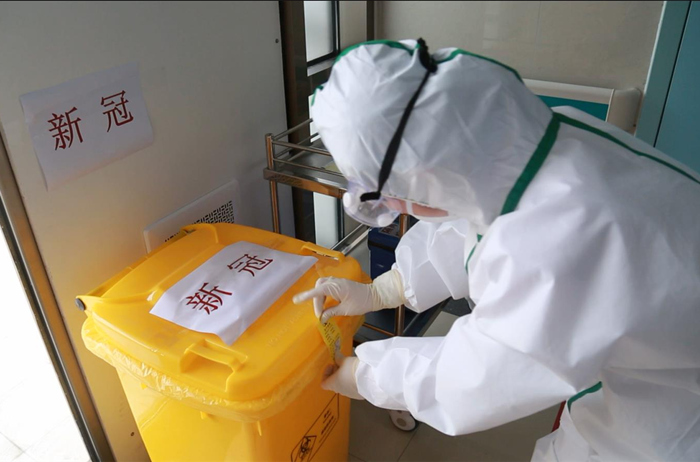 据了解,该院新冠病房内与患者有接触的所有垃圾都被视为“新冠”医疗废物,除隔离服、口罩等医用防护品外,饭盒、纸巾、筷子甚至报纸等都由专业人员密封处置并在24小时内迅速转运。标有“新冠”字样的醒目黄色垃圾袋、垃圾桶专门用于装袋和转运。为防止交叉感染的发生,医院专门处理“新冠”医废的人员身穿防护服对垃圾袋采用鹅颈结式特殊手段进行包扎密封,经称重记录、消毒喷洒、扫码确认等多重环节处理后,从专用通道运送至医院的垃圾固体废物暂存处置中心。暂存处置中心为普通固废和“新冠”医废开辟双门分开清运,即一个用来运送普通医疗废物,一个专门用来运送新冠医疗废弃物。