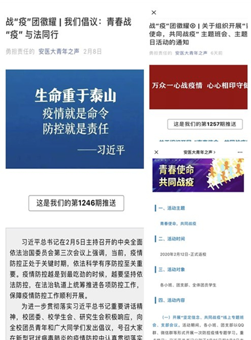 校团委和全校二级团组织充分发挥新媒体平台优势,及时发布团中央和团省委有关号召和部署。我校广大团员青年按照“组织化、本地化、社区化、安全第一”原则,主动向当地党团组织报到,在地方统一调度下,就近就便编入社区(村)疫情防控青年志愿者组织、青年突击队,主要承担包括宣传防疫常识、体温监控,入户调查、宣传资料发放、车辆放行、人员劝导、数据核查等工作。