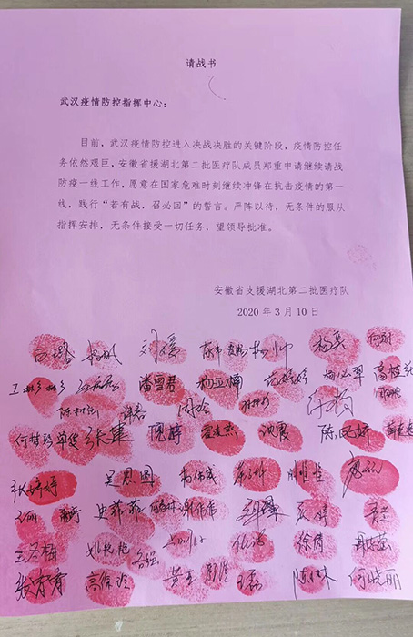 “严阵以待,无条件服从指挥安排,无条件接受一切任务,请批准!”“我们向组织提出请求,申请继续坚守在武汉抗疫的第一线,为赢得抗击疫情战斗的最后胜利,贡献自己的一份力量!”“我们向组织请战,愿意最后一批撤离,随时听候组织调遣,请组织批准!”……近日,我校各直属附属医院支援湖北医疗队的队员们再一次庄重地写下了重返“战场”的请战书。他们纷纷表示,“疫情不退,我们不退”,将坚决服从命令,听从指挥,为抗击疫情取得最后胜利,继续贡献力量。