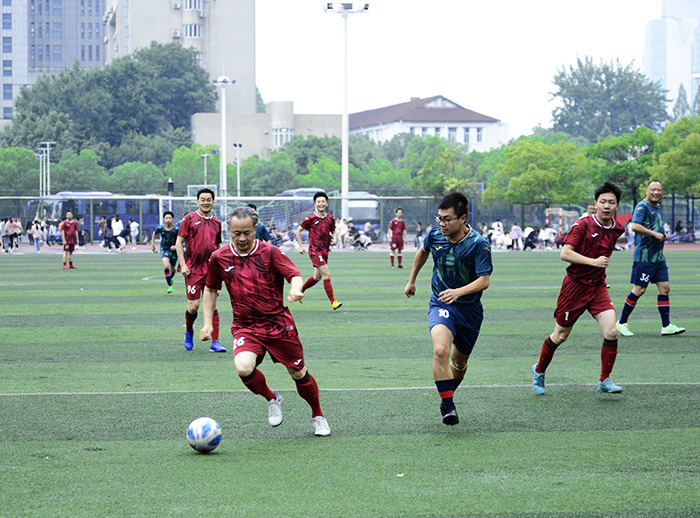 经过充分热身后,随着裁判员一声哨响,翁建平为比赛开球,球赛正式开始。绿茵场上,两队拼抢积极,导师和研究生配合默契,全力以赴,既有短传快攻、整体推进,又有防守反击、长传冲吊。球员们以流畅的脚法、漂亮的盘带、巧妙的过人技术,为大家带来一场精彩纷呈的足球比赛。