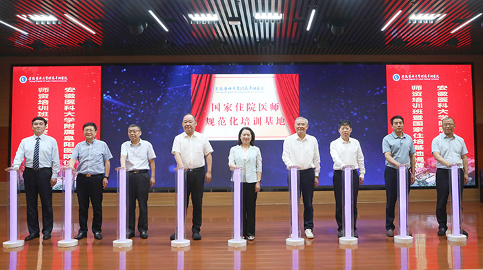 7月11日,附属阜阳医院在医院行政楼四楼会议室举行住培师资培训班暨国家住培基地揭牌活动。副校长余永强、阜阳市副市长杨善竑出席活动并共同为住培基地揭牌。