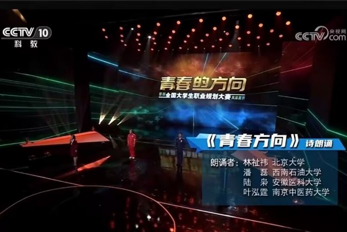 9月6日晚间8:30,由中央广播电视总台、教育部、上海市人民政府、复旦大学联合录制的“青春的方向——首届全国大学生职业规划大赛风采展示”节目在中央电视台科教频道(CCTV-10)首播。作为优秀基层就业生代表,我校第一临床医学院2016届医学影像学专业毕业生陆枭应邀参加,并参演诗朗诵《青春方向》。