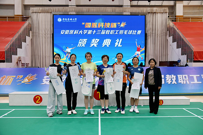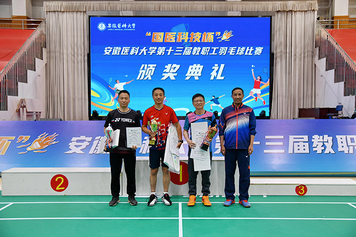 经过激烈角逐,校本部一队、第一附属医院、第二附属医院代表队获活力组团体前三名;校本部二队、第二附属医院、第一附属医院代表队获益壮组团体前三名。口腔医学院(附属口腔医院)何帆、第一附属医院刘城、第二附属医院吴炎获活力组男子单打前三名;第一附属医院陈玺、图书档案馆陈琦、公共卫生学院夏京京获活力组女子单打前三名;第二附属医院夏磊、方刚,第一附属医院尚子祥、时金龙,安徽省公共卫生临床中心秦昆鹏、何笑霖获活力组男子双打前三名;第一附属医院司静静、刘曼丽,安徽省公共卫生临床中心吴晓珍、孙侨侨,生命科学学院杜悠雯、李超获活力组女子双打前三名;医学人文学院曹建军、吴静,第二附属医院汪卓赟、丁月,第一附属医院王建生、陈会会获活力组混合双打前三名。基础医学院陈兵、第一附属医院周勇、第一附属医院李峰获益壮组男子单打前三名;第二附属医院梁敏、赵茜云、第一附属医院邓谊萍获益壮组女子单打前三名;第二附属医院程景林、赵欣,附属巢湖医院汪超、张运峰,公共卫生临床中心常俊、吴云峰获益壮组男子双打前三名;后勤保障部朱颖、周文华,附属巢湖医院余海燕、郎雪颖,第一附属医院高华、姚小醒获益壮组女子双打前三名;第二附属医院何水红、白寰,基础医学院徐龙、张素梅,第一附属医院高晓平、陈琼获益壮组混合双打前三名。