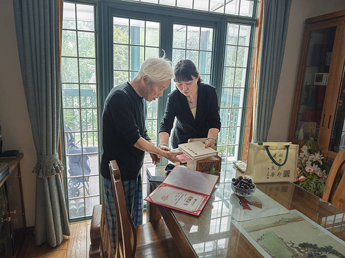 图书档案馆直属党支部书记张芳带领档案工作人员前往康诗纬家中接受捐赠,并回赠档案文创产品,对其无私捐赠表达了诚挚感谢。她表示,学校百年校庆在即,康诗纬先生的捐赠是一次历史文化与艺术精神的薪火相传,这些珍贵物品极大丰富学校的馆藏资源,为校史研究、医学文化传承和艺术教育提供鲜活素材。