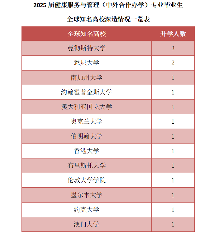 此次升学成果不仅体现了该专业学生的卓越能力和国际竞争力,也充分展示了中外合作办学的独特优势和良好前景。未来,健康服务与管理(中外合作办学)专业将继续秉承“立足中国、放眼世界”的理念,致力于为国家卫生健康事业和全球公共健康治理培养更多具有国际视野与本土实践能力的高素质复合型人才。(卫生管理学院 国际学院)